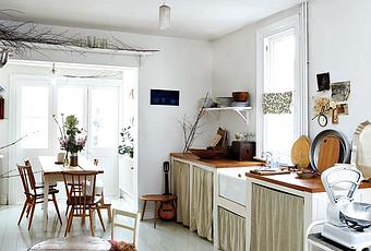 Cette maison, c'est mon gros coup de cœur du week-end. Elle a su prendre un petit coup de jeune tout en conservant tout son charme d'antan. Carreaux de ciment, parquet à larges lamelles, escalier négligemment poncé, porte à vitrail. L'ambiance y est simple, douce et chaleureuse. Les matières sont nobles. Je crois que ce qui me fait vraiment, vraiment fondre, se sont les petites touches de tissu liberty placées subtilement un peu partout et qui viennent égayer en toute discrétion chaque pièce décorée pour le reste avec beaucoup de sobriété. Et puis bien sûr, les petites touches rétro que l'on retrouve partout ne sont pas non plus pour me déplaire : cette balance dans la cuisine, ce banc dans l'entrée, ces tableaux dans le couloir, ce miroir dans la chambre, ce voilage dans la douche... Hmmm elle m'inspire du bon cette maison !