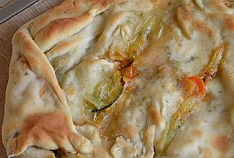 - Badigeonner de sauce tomate la moitié droite de chaque pâton. Garnir de légumes et de mozzarella. Saler & poivrer. Parsemer de thym et d'origan séchés.