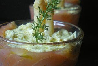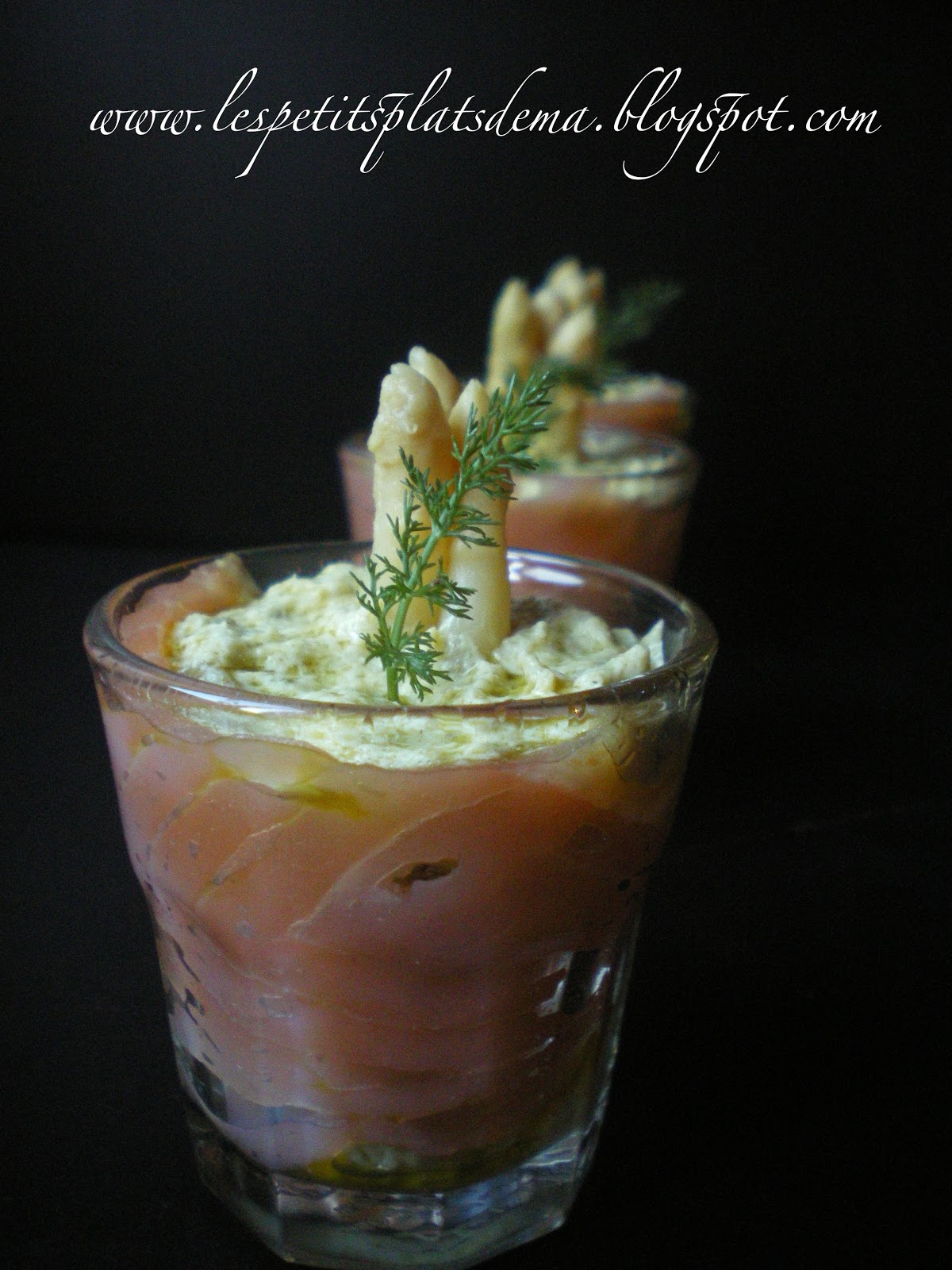 Pour 6 verrines :- 2 c à s de mascarpone- 1 pot de sauce asperges vertes «Sacla»- 1 grandes tranches de saumon fumé- 1 petit bocal d'asperges- Aneth ou autres herbes pour décorer- Sel, poivre