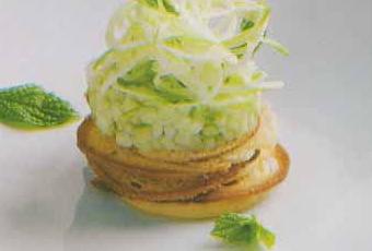 Dans une assiette, monter : crème caramel au beurre demi-sel, tranche de pain, crème caramel au beurre demi-sel, tranche de pain, crème caramel au beurre demi-sel et tranche de pain. Poser dessus une boule de granité de pommes vertes puis une julienne de pomme verte.
