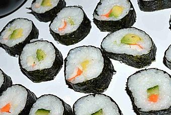 Poser une feuille de nori sur une planche, déposer un peu de riz sur un tiers de la feuille, ajouter des batonnets de carotte, avocat, surimi, concombre au choix, mettre des feuilles de menthe ou de ciboulette ( on a oublié sur certains et c'est plus fade).