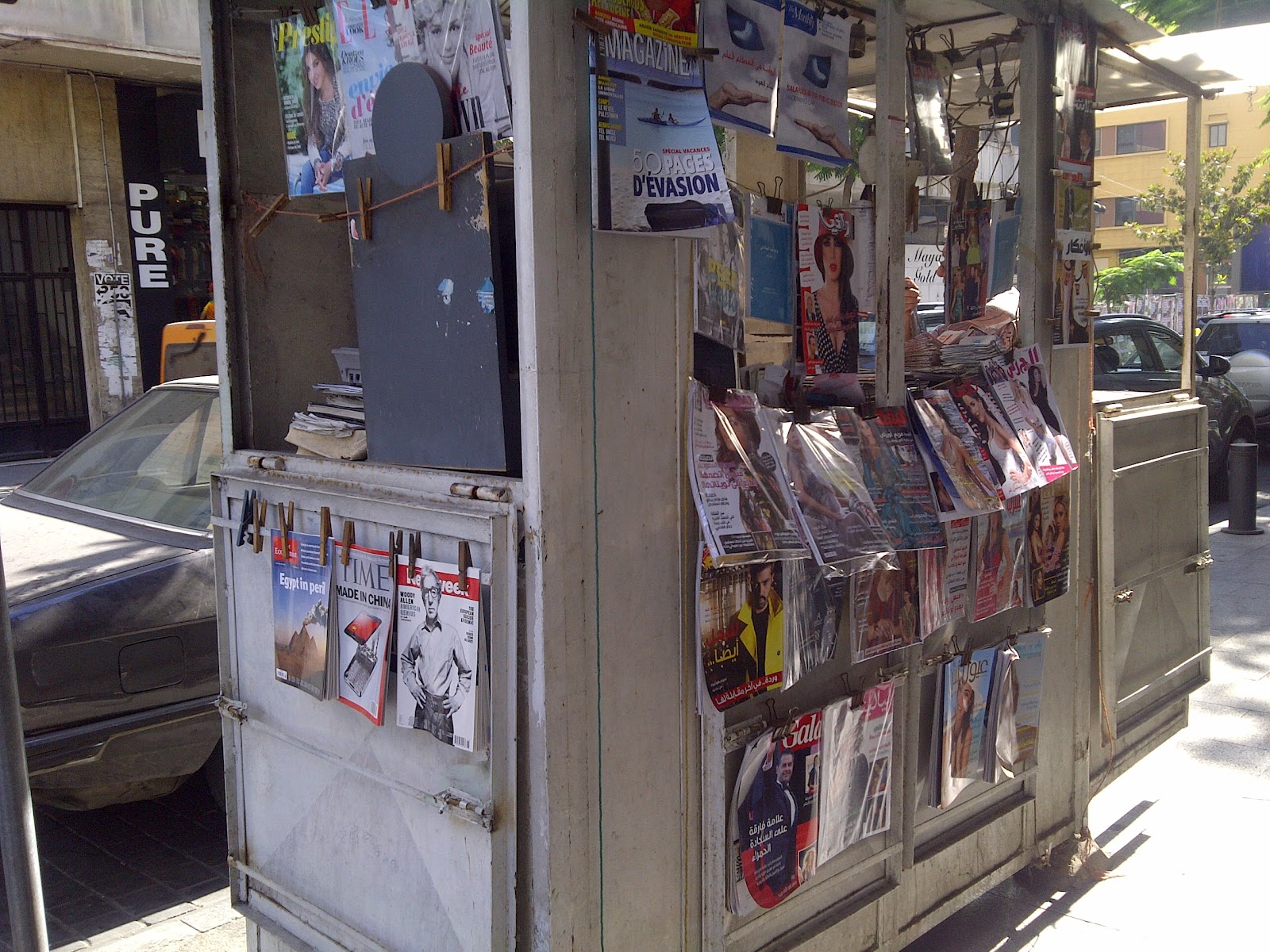 Je me rends vers le kiosque à journaux pour acheter L’Orient-le jour. Le vieux monsieur somnole. Je le réveille. Je trouve L’Express sur les Salafistes en Tunisie, pas d’Orient-Le jour. « il est épuisé » me dit le Monsieur aux petits yeux usés par la lecture. Pas grave, j’ai besoin de monnaie, je lui tends mon billet de 50 000 livres. Il lève les yeux : Tu veux l’Orient ? Oui, s’il vous plaît. Alors événement théâtral : il sort de son kiosque, traverse la petite rue Hamra en se dandinant, sûr de lui, vers la Librairie d’Orient. Il s’absente un certain temps. Puis revient, redandine vers son kiosque en slalomant à travers les autos comme il l’a toujours fait et pénètre dans sa petite roulotte de journaux. Victorieux, il me tend le journal.AUB (Université Américaine de Beyrouth) entrée prncipale