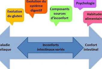 A l'une des extrémités du schéma, il y a l'intolérance au gluten ou maladie coeliaque : le fait de manger des aliments contenant du gluten attaque les villosités de la paroi de l'intestin et cela crée douleurs, fatigue, perte de poids, ... Cela arrive souvent dès l'enfance mais aussi potentiellement vers 40 ou 50 ans. Si on a des présomptions d'avoir cette intolérance, il faut vraiment faire des examens sanguins pour le vérifier plutôt que de décider seul(e) d'arrêter le gluten.