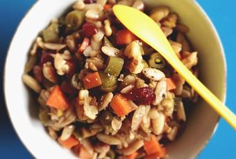 Coupez les haricots en tous petits tronçons, 2 carottes en minis dés, et 12 olives vertes dénoyautées en quarts de rondelles, puis mélangez le tout aux pâtes.