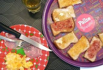 Et voilà comment Ruben est passé d'un bol de chocolat avec tartines à un oeuf brouillé avec du bacon, des tartines de confiture et du jus de pomme (banane ou poire pour moi !).