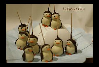 5. Placer le chocolat noir dans une assiette creuse, le faire fondre comme pour le chocolat blanc. Tremper le dos des pingouins dans le chocolat noir. Les reposer debout sur le papier sulfurisé. A l'aide d'un cornet en papier, faire les yeux en chocolat noir.