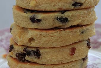pour 12 welsh cakes de 8 cm : 110 gr de beurre salé froid 225 gr de farine 1,5 cuil de levure chimique 85 gr de sucre en poudre 1 oeuf une poignée de raisins secs ou cranberries séchées beurre pour la cuisson