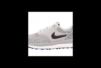 La Nike Air Safari a une empeigne en daim gris clair contrasté par du safari print, des accents de noir et une touche de bleu sur la semelle extérieure.
