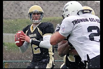 Les Templiers ont de leur côté confirmé leur belle victoire de la première semaine avec un nouveau succès samedi soir à Elancourt. Pour les visiteurs, les Centaures de Grenoble, ce fut un peu le remake de la semaine précédente à Nice. En effet comme chez les Dauphins, les Grenoblois démarraient bien, dominant les débats et menant au score et ayant même l’occasion de le creuser. Mais sur une interception gagnante de Mike Douglas de 70 yards les Templiers remettaient les pendules à l’heure. La défense des Templiers allait alors étouffer pour le reste de la partie l’attaque dauphinoise et comme les Dauphins avant eux user l’effectif manquant de profondeur des Grenoblois. A l’arrivée la note sera quasi la même qu’à Nice : 34-7 contre 34-8 7 jours plus tôt. Le QB d’Elancourt Vinnie Miroth aura eu entre temps l’occasion de montrer l’étendue de son talent, bien épaulé par un trio de receveurs (Eckmans/Larroque/Gerard) qui devrait faire souffrir nombre de défenses cette saison. Enfin hier c’était l’heure de la reprise pour les Cougars de St Ouen l’Aumône. Sous la neige le spectacle fut au rendez-vous face à des Black Panthers venus chercher les points perdus à Pessac. Une jolie opposition de style entre l’attaque aérienne locale (Verica 24/36 pour 296 yards) et le trident de coureurs haut savoyards Kiernan/Neville/Thomas. Thomas terminera d’ailleurs le match avec des stats impressionnantes : 13 courses pour 209 yards et 1 TD. C’est Thonon qui fera la course en tête presque tout le match mais ne pourra jamais vraiment distancer les Cougars. Perdant leur QB M Sprauel sur blessure en 3ème quart, peut-être plus emmoussés que les locaux après deux matchs très physiques, les Blacks craquaient en toute fin de match. Un fumble savoyard puis un drive gagnant de Verica dans la dernière minute du match permettaient aux Cougars d’arracher la victoire 28 à 23. Une seconde défaite de suite dans les dernières secondes du match pour Thonon qui prend ainsi un sérieux retard sur son tableau de marche.