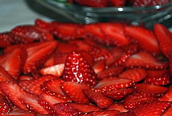 Laver les fraises et ôter le pédoncule . Les couper en 2 verticalement ou en lamelles comme sur les photos.