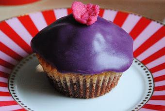 6. Pour le glaçage, mélangez 150 g de sucre glace avec 4 c.s d'eau colorée (violet ici). Appliquez sur le gâteau et déposez un pétale de rose cristallisé.
