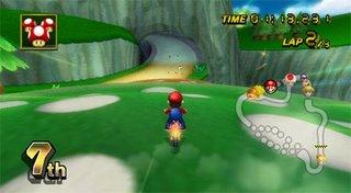 Les habitués de Mario Kart : Double Dash ! !, précédent opus sur GameCube, risquent de ne pas trop reconnaître leur jeu : une bonne partie du gameplay a changé, et on est cette fois plus proche des Mario Kart classiques et notamment de celui, plus simple, sorti sur DS il y a trois ans. Il y a tout de même quelques nouveautés, la plus visible étant un nouveau véhicule, qui change un poil le concept : une moto. Le passage sur deux roues (obligatoire quand on joue en solo) demande un petit temps d’adaptation. On ne tourne pas de la même façon et les dérapages deviennent vitaux. Surtout, la petite moto paraît bien fragile face aux autres véhicules, et un kart l’enverra à coup sûr voler en cas de collision. Reste que la moto a un avantage décisif face aux karts : en remontant vers soi le volant Wii, on se lance en roue arrière, ce qui donne un sérieux coup de boost en ligne droite. Pratique.