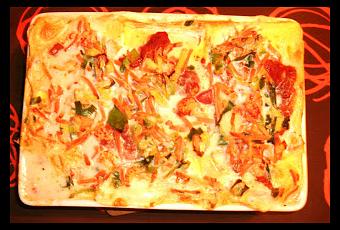 Dans un plat à gratin préalablement beurré, de la béchamel, une couche de lasagne, le poisson+légumes+sauce tomate+béchamel On recommence avec une couche de lasagne, les crevettes +légumes +sauce tomate+béchamel. On termine par une couche de lasagne+des légumes+béchamel. Au four -entre 35 et 45 min à 180 °, une feuille d'alu par dessus durant les 20 premières minutes.