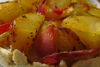Hier soir j’ai tenté les navets caramélisés. Des navets, un peu de sucre et de beurre et nous avions un bel accompagnement. Comme je n’étais pas très sûre de mon coup, j’avais fait aussi revenir des pommes de terre. Ce midi, me voici donc avec un reste de navets et un reste de pommes de terre sautées. Une demi pâte brisée plus tard et voilà deux tartelettes. Laquelle préférez-vous, pommes de terre sautées ou navets caramélisés ?