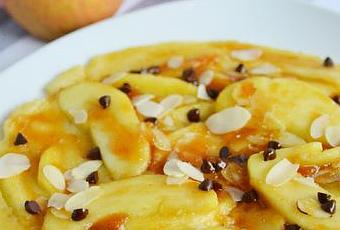 Renversez sur une assiette, badigeonnez de caramel de pommes et parsemez d'amandes effilées ainsi que de pépites de chocolat.