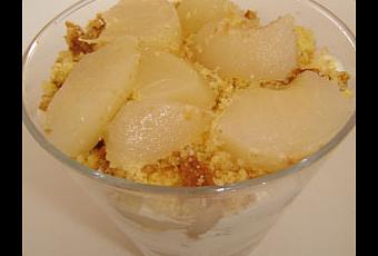 Dans vos verres, émietter un peu de palet breton au fond. Couper quelques bouts de poires, verser la crème. Répéter cette opération jusqu’en haut !