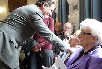 Arnaud Montebourg salue François Seligmann lors de l'inauguration de l'exposition Pierre Mendès France à la mairie du 3e à Paris. (photo Jean-Charles Houel)