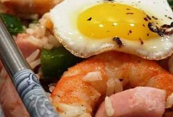 Ajoutez le jambon, le poulet, les crevettes, les herbes et le piment et le reste d’huile.
