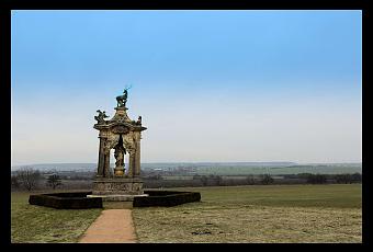 Notez que l'outrecuidant "František Antonín Špork", caressait le secret espoir qu'en remerciement, Charles VI lui rendît la pareille avec un ordre du mérite, voire de la toison d'or. Mais il n'en fut rien. A défaut, fit quand même construire plus tard, et en souvenir de la bonne rigolade, le splendide monument dont je vous parle en ce moment. Pendant cette "bonne rigolade" de 1723 à laquelle prirent part plus de 1.000 chasseurs, 40.000 rabatteurs, et un nombre incalculable de chiens que la forêt en était impraticable pendant plusieurs mois, le massacre fut d'une telle intensité qu'il fallut plusieurs années à la nature pour s'en remettre. Les références de l'époque ne mentionnent pas les détails, mais juste pour vous donner une idées, l'escorte de l'empereur se lâcha quelques années auparavant en cette même forêt près de"Hlavenec". Résultats de 2 semaines de massacre: 195 cerfs, 41 biches, 21 faons, 314 daims, 137 chevreuils, 356 sangliers, 250 porcelets, 43 renards, 7 lièvres et 1 carpe, abattue involontairement lorsque le dentiste impérial tomba dans l'étang de son cheval emballé. Sans dec, la chasse à courre, c'est vraiment un sport pour les hommes, les vrais, moi j'dis. Le mémorial Bon, et il ressemble à quoi alors ce mémorial me demanderez-vous? Un socle triangulaire joliment décoré de 3 cartouches aux motifs de la chasse au sanglier, de la chasse au cerf et du banquet de chasseurs, repose sur un plan de pierre brute. Sur ce socle est posée comme une chaplette tabernacloïdale de côtés concavement enfoncés dans le dedans. Les arrêtes verticales sont formées par des colonnes doriques (parfois toscanes, mais l'ordre toscan étant un simplifié du dorique, c'est bonnet blanc et glande au nez) renforcées intérieurement par des piliers romains lesquels supportent une toiture à corniche segmentée de cartouches aux motifs de l'ordre de St Hubert. Accrochées aux colonnes et aux piliers, des tentures entremêlées de putti flottent au vent et s'ouvrent sur la scène principale (cf. plus loin). Sur la toiture, est représentée la vision de St Hubert (l'abus de Jägermeister est nocif pour la vue): au centre, sur un piédestal devant lequel un putto tient les armoiries du comte , le cerf (blanc?) à croix dorée entre ses bois tance St Hubert agenouillé comme une andouille dans un coin du triangle. Une meute de chiens abasourdis par la scène irréelle se trouve sur le toit en bout de second angle comme témoins du miracle. Et le troisième angle est occupé par un canasson couché dont j'ignore la symbolique (hommage à St Findus?). Quant au motif principal, sous la coupole St hubertienne, il représente l'empereur Charles VI en personne et grandeur nature, vêtu des frusqu'armures des empereurs romains et d'une perruque qui n'est pas sans rappeler un d'sous de bras portugais. Du reste, la posture n'est pas sans rappeler un Louis XIV de Hyacinthe Rigaud: tête tournée au 1/4 de l'axe du tronc, main droite appuyée sur une cane, bras gauche reposant en angle droit sur la hanche, un pied légèrement en avant et le regard hautain, genre"ben moi quand je pète, ça sent même pas mauvais. Na!". Le mémorial de type "dais" ou "baldaquin" est haut de quelques 10 m, et large/profond de quelques 5,5 m. L'oeuvre construite entre 1724 et 1725 en grès blanc, fut proposée et architecturée par le grand"František Maxmilian Kaňka", tandis que les statues sont d'un autre grand, "Matyáš Bernard Braun". Notez que déjà en 1720, le mécène finança, et les 2 génies construisirent à "Stanovice", près de "Kuks", une construction similaire que certains analphabètes architecturaux considèrent comme identique. Les béotiens! En "Stanovice", l'édifice est plus chaplette que mémorial, construit sur une base carrée et non triangulaire, tandis que les statues représentent la Ste trinité versus Charles VI. C'est tellement différent que ça n'a rien à voir. Bref, notre mémorial de "Hlavenec" se situe sur un infime petit monticule, duquel s'ouvre une vue imprenable sur plusieurs kilomètres de champs à 180°. Il fut inauguré le 4 novembre 1725 (soit 2 ans et 1 jour après la fameuse chasse, c'est pourquoi certaines sources parlent du 3 novembre au lieu du 4, pour faire 2 ans pile-poil, ceci-dit on s'en fout, non, le 3 ou le 4?) à grand renfort de publicité. Comme dit plusieurs fois auparavant, "František Antonín Špork" faisait dans la lèche-culterie industrielle de masse, en particulier si le cul-léché était à même de magnifier l'ego du comte. Or l'empereur de toutes les Autriche... aussi François-Antoine n'avait pas assez d'une seule langue pour honorer son épatante mirobolance. L'idée première était cependant de coller la statue de Charles VI sur le pont de Charles IV. Mais l'affaire capota rapidement. Elle capota d'abord pour une évidente raison de confusion entre les 2 Charles, ensuite parce que les statues du pont sont exclusivement des sanctifiés (hors Jésus, dieu, "Bruncvík" et autres faire-valoir négligeables).