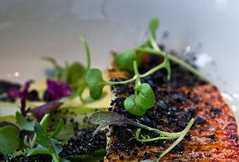 Petit aparté sur ce déjeuner, où le chef Jon Irwin était au mieux de sa forme. Les assiettes sont toujours aussi graphiques et colorées, savamment composées, et délicieusement goûtues. Après des petits sablés à la tapenade et guimauve au parmesan, nous commandons en entrées l'Escalope de foie gras au sésame noir, chutney Daïkon, soja et nori, exceptionnelle, tendre et savoureuse, j'en reprendrais bien pour la suite du repas, à vrai dire… et le Filet de rouget, asperges vertes, vinaigrette orange sanguine, fromage blanc et menthe poivrée, basilic pourpre, je vous laisse imaginer l'explosion en bouche, c'est fin, c'est frais, c'est… parfait !