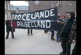 J’aurais aussi pu vous raconter, pour faire comme dans les reportages du journal de Jean-Pierre Pernault, que nous allions goûter au charme délicat et désuet de ce petit village paisible ; mais une fois encore, la réalité n’est pas aussi douce qu’on le souhaiterait : si j’allais là-bas avec mon amie Marjorie (c’est juste une amie, ben oui, hey, what did you expect ?), c’était pour participer à la manifestation organisée pour protester contre l’installation, prévue la préfecture, d’installer une décharge géante et une usine de traitement des déchets…à la lisière de la forêt de Brocéliande ! Et oui, vous avez bien lu ! La forêt mythique de la Bretagne, celle de Merlin et du roi Arthur est considérée par l’État comme une poubelle ! Ça va faire joli dans le paysage, tiens ! Sans parler des problèmes que ça risque de poser pour la santé des gens du coin ! Voilà bien l’humanisme de façade de la Ripoublique française : par-devant, on met en avant le patrimoine pour attirer les touristes, par-derrière on le saccage sur l’autel du profit ! Par-devant, on prend douze milliards de précautions pour la santé publique, par-derrière, les pauvres Bretons ruraux peuvent bien crever tant que ça rapporte ! Par-devant, c’est « sauvons la nature », par derrière c’est « sauvons nos dividendes » !