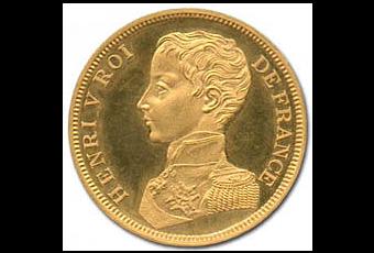 J''ignorais l'existence du dernier roi de la lignée française des Bourbon sous le nom d'Henri V. Bon c'est sûr qu'il était difficile de connaître un roi âgé de 10 ans, sans trône ni couronne, qui n'a été "Henri V" non-proclamé que pendant huit jours du 2 au 9 août 1830, le temps que Louis-Philippe d'Orléans arrive sur le trône. Mais visiblement il en reste des traces pour les numismates...