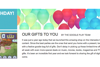 Joyeux anniversaire Google Play Store! Sortez les bougies et le gâteau, le magasin de Google Play vient de fêter ses 1 ans. Eh bien peut-être demain ce sera au moins. Pour rappel, l'Android Market a toujours existé, mais il a été 1 an depuis il a été remplacé avec ce que nous connaissons et aimons aujourd'hui que le magasin Play. Pour célébrer Google a beaucoup d'offres et des cadeaux pour nous, et ils seront disponibles et changer toute la semaine.Qui est prêt pour des tonnes d'offres spéciales, des offres exclusives et des rabais sur l'ensemble de nos applications et jeux préférés? Lorsque ces ventes ont généralement lieu Google développeurs d'applications autres baisser leurs prix aussi, donc nous avons le sentiment de cette semaine offrira d'excellentes affaires et des réductions. Alors rien d'étonnant est apparu encore, nous pouvons nous attendre à arriver toute la semaine.