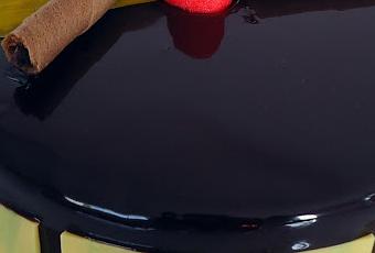 Ici, le dessert est composé d'une mousse au chocolat noir, renfermant un insert à trois étages de crémeux aux mûres de ronces, mousse au chocolat blanc Zéphyr et crémeux aux fraises des bois. La base est un biscuit Joconde vert et le tout est recouvert d'un glaçage miroir noir au cacao 22%.