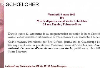 Céline Malraux, interviewée par Eric Lefèvre, journaliste de Guadeloupe 1ère, présentera l'ouvrage écrit avec sa grand-mère Madeleine, veuve d'André Malraux, Avec une légère intimité. Le concert d'une vie au coeur du siècle, publié en octobre 2012 chez Baker Street-Larousse.
