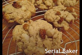 Mélanger farine, sucre et levure. Ajouter la purée d'amandes, mélanger du bout des doigts et ajouter l'eau pour obtenir une pâte légèrement collante. Incorporer enfin les noix de macadamia et les mulberries. Former (avec les mains) des boules de pâte de la grosseur d'une grosse noix et les aplatir légèrement sur une plaque recouverte de papier sulfurisé. Cuire au four (th6, 180°C) pendant 10 minutes environ. Laisser refroidir avant de déguster.