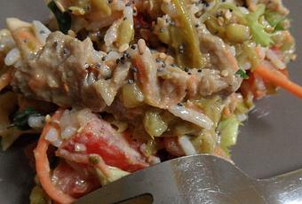 Coupez en lamelles le boeuf et placez le dans un saladier, ajoutez le reste des ingrédients (le riz peut être remplacé par des pommes de terre vapeur froides et coupées en cubes).