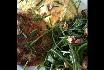 Jus de tomate ou jus d'orange + oeufs brouillés au lard + galette de purée de pommes de terre parmesan + salade verte noix ciboulette + fromage blanc salé ou sucré + gâteau du jour au choix + pain beurre confiture maison + boisson chaude au choix ou verre de vin, Sauvignon ou Merlot.