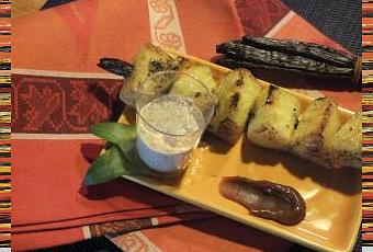 Aujourd'hui j'ai choisi de cuisiner un fruit savoureux et diététique qui en plus est de saison. Cette recette sait mettre en valeur l'ananas. J'ai eu envie de cuisiner les gousses de vanille alors pourquoi ne pas s'en servir comme pic à brochettes. Le parfum vanillé vient sublimer ce fruit de saison.