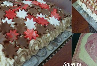 8 oeufs250gr de sucre roux250gr de farinevanille en poudreMonter les blancs en neige ferme.Ajouter le sucre petit à petit pour obtenir une texture brillante.Ajouter les jaunes un par un en continuant à fouetter doucement.Puis la farine, mais à ce stade, ne pas trop mélanger.Si vous voulez créer un décor, réserver une partie de pâte et la colorer,pour moi ce sera avec du coulis de framboise.Verser dans le moule.Four 150°C pendant 30 minutes.Laisser refroidir.Décorer avec de la crème au beurre.Et ensuite avec des étoiles découpées dans de la pâte à sucre.