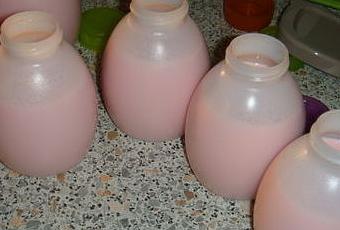 Je mélange dans une casserole 1 litre de lait 1/2 écrémé, 6 cs de sirop à la fraise ou framboise, 1 sachet de ferment lactique.