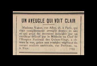 Complètement aveugle depuis vingt ans et demeurant au 28 rue Affre, une certaine madame Vanse aurait recouvré la vue grâce "aux remèdes végétaux du savant oculiste américain, rue Pertinax, 14, à Nice". Tout du moins, c'est ce qu'affirme cette réclame trouvée dans l'édition du 2 avril 1909 du journal Littoral (p.3).