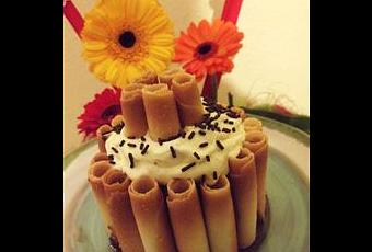 Coupez la base des cigarettes russes. Disposez-le autour d’un cercle à pâtisserie. Versez la crème au centre. Disposez les petits bouts de cigarettes russes sur le dessus.