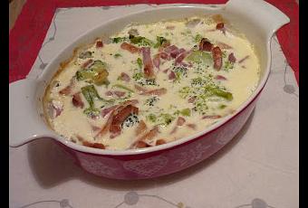 Dans un plat allant au four, répartir les brocolis égouttés, les lardons et verser l'appareil par dessus.