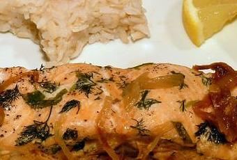 Pendant que les oignons mijotent, faire macérer les pavés de saumon avec l'estragon et l'aneth bien lavés et hachés, le sel et le poivre.