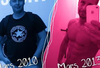 Steeven se met au sport, tout d'abord avec beaucoup de cardio, environ 10 heures par semaine, puis il ajoute des séances de musculation en salle de sport et un programme en ligne signé Grégory Capra !En deux ans, Steeven perd près de 30 kg. Depuis un an son poids est stable, autour de 72 kg avec des pectoraux et des abdos dessinés.