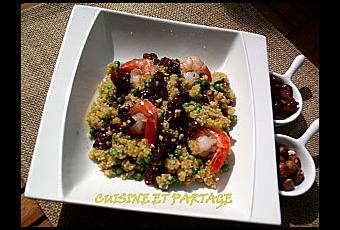faire cuire le quinoa et les lentilles corail 15 mn. Passer et laisser refroidir. Faires cuire les petits pois surgelés à part et mélanger au quinoa et lentilles. Ajouter les crevettes décortiquées et cuites.