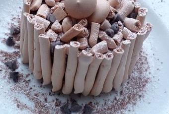 Commencer à monter le blanc en neige avec le sel, puis ajouter le sucre petit à petit. Placer ensuite le bol sur un bain-marie et continuer de fouetter au fouet électrique jusqu'à ce que la meringue devienne plus compacte et tiède au doigt. Retirer alors du bain-marie et continuer de fouetter encore 3.4 minutes que le mélange refroidisse en ajoutant le cacao. Mettre dans une poche à douille avec une petite douille ronde et dresser sur une plaque recouverte de papier sulfurisé 2 cercles de meringues pour faire le socle d'environ 7.8cm (selon le cercle dont vous disposez). Puis faire pleins de petites meringues fines de 5.6cm. Faire cuire à 100°C pendant 2h30 et ouvrant de temps en temps le four pour faire sortir la vapeur. Laisser refroidir 1h.