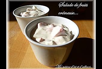 Bonjour, voici une petite salade de fruits d'inspiration Philippines... Un petit dessert très frais et tout doux... Pour 4 personnes, il vous faut: 3 mandarines 1 pomme 200 gr de chair de coco (pour ma part elle était surgelée...) 100 gr de nata de coco (jus de coco sucré et gélifié qu'on peut trouver en épicerie asiatique) 1 papaye bien mûre 15 cl de crème liquide 2 cuillères à soupe de sucre glace 75 gr de lait concentré sucré Décongelez la chair de coco Préparez une chantilly avec la crème liquide, ajoutez le sucre glace. Égouttez la nata et la chair de coco. Pelez les mandarines en retirant toutes les parties blanches. Épluchez la pomme et taillez-la en petits cubes. Pelez, épépinez et taillez la papaye en petits cubes également. Placez tout les fruits dans un saladier. Mélangez délicatement la chantilly avec le lait concentré. Versez le mélange sur les fruits et mélangez soigneusement. Couvrez le plat avec un film alimentaire et réservez une heure au réfrigérateur. Répartissez la salade de fruits dans des coupelles avant de servir...