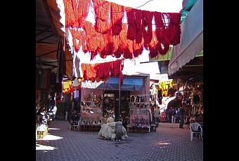 L’allée centrale qui traverse les souks et qui va de la place Jamâa El Fna jusqu’à la Medersa Ben Youssef et réservée en priorité aux échoppes de ventes, sorte de front office en contact direct avec les clients et alimentés à l’origine par les artisans qui travaillent dans les ruelles adjacentes. Les souks sont organisés en corporations de métiers d’où leurs noms : Attarines (Epiciers), Nejjarines(Menuisiers), Kassabines(Vanniers), Haddadines(Forgerons), Cherratines(Selliers), Sabbaghines(Teinturiers),Fekharines(Potiers),Dhabia( Bijoutiers) etc…. des noms que l’on retrouve aujourd’hui comme patronymes de familles marocaines musulmanes et juives.