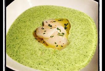 Verser le velouté dans des assiettes creuses et déposer les tranches de noix de Saint-Jacques qui cuiront légèrement dans le velouté.