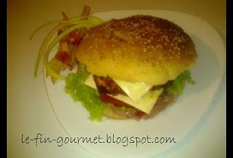 - étalez la mayo sur le bun inférieur , mettez une bonne couche d'oignons , des feuilles de laitue , des tranches de tomates , puis une tranche d’Emmental , le poulet pané , la sauce piquante , une autre tranche d’Emmental , remettez le bun supérieur