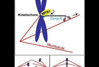 En phosphorylant Cnp-E au niveau du kinétochore, la kinase MPS1 permet le déplacement des chromosomes vers la plaque équatoriale du fuseau mitotique, et participe donc à l'alignement des chromosomes, nécessaire à leur séparation équitable entre les deux cellules filles. Copyright A. Abrieu / CNRS
