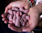 Ce matin on commence à voir le marquage des ratons. Il y a des siamois blue point, des irish bleus américain, des hooded bleus et je crois même avoir vu un capé bleu. Ils sont magnifiques! A eux tous ils pèsent 105 grammes. Le poids moyen est donc de 7,5 g. Cependant ceux qui pesaient 5 g le jour le la naissance pèsent à présent 7 g. Ceux qui en pesaient 6 pèsent 8 g, quant à celui qui en pesait 7, le dominant, le glouton de la bande, pèse 9 g. Quel que soit le moment où je contrôle leur ventre, les quatorze bébés sont toujours repus. Hedwige est vraiment une super maman rate!