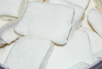 First time I ate traditional marshmallows, it was a real revelation… Sometimes I would see some in baker’s shop but I never really wanted to have some but now since I’ve tasted some, it’s simple, I only dreamed of doing some myself. Because I thought the recipe might be too complicated I never really tried until I found a recipe that really looked simple…so as soon as I had a good occasion to make some, I just had to try!! Ingredients (for 30 to 40 marshmallow): -1, 1/4 cups of sugar -3/4 cup of icing sugar -3/4 cup of corn starch -3 egg whites -1/3 cup of water -3 tablespoons of honey -7 gelatine leafs -1 tablespoon of orange blossom water -neutral oil Prepare your moulds, square or rectangular if possible; oil them with neutral oil on an absorbing paper. Mix together the corn starch and the icing sugar than pour part of this mixture in the moulds and spread on each to make a sort of “carpet”. Put aside the rest of the mixture. Put the gelatine sheets in a bowl of cold water. In a sauce pan, put the sugar, the water and the honey and cook on a medium heat to 266°F and check with a candy thermometer. Meanwhile beat the eggs with an electric beater on low speed. Once the syrup is at the right temperature, take it out of the heat, soak the gelatine leafs than add them to the syrup and stir until complete dissolution. Incorporate this syrup to the egg whites while beating, like an Italian meringue then add the orange blossom water. Increase the speed and continue beating until the bowl is warm. Pour this Italian meringue in your moulds and smooth the surface. Share the rest of the corn starch-icing sugar mixture on the surface and put in the fridge for at least 4 hours. Once it’s done, check that your marshmallow is firm then remove from the mould and cut as you like.