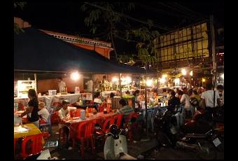 En plein centre touristique de Siem Reap, il y a une rue affreuse et désagréable : Pub Street. Au bout de cette rue se trouvait encore en Juin 2012 un bâtiment servant on ne sait pas trop à quoi ni à qui, genre école avec une grande cour triangulaire devant. La nuit tombée, tout ce « triangle » se remplissait de cantines khmeres délicieuses, dans lesquelles d’ailleurs les touristes jetaient les dernières ressources de la pile de leur appareil photo, « tellement typique, chéri ! », mais sans oser y pénétrer. Les gosses de rue venaient y chercher un peu à manger. Les khmers, quelques backpackers et votre serviteur y avaient leurs habitudes de wok, de fried rice et de jus de lait de coco. Tout a changé en quelques semaines.